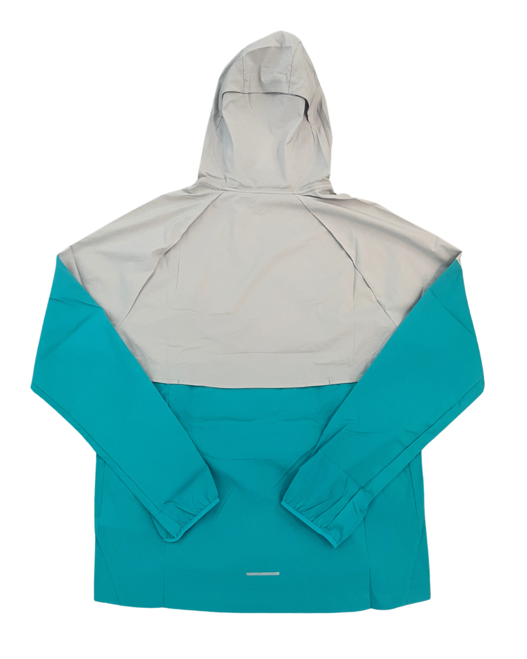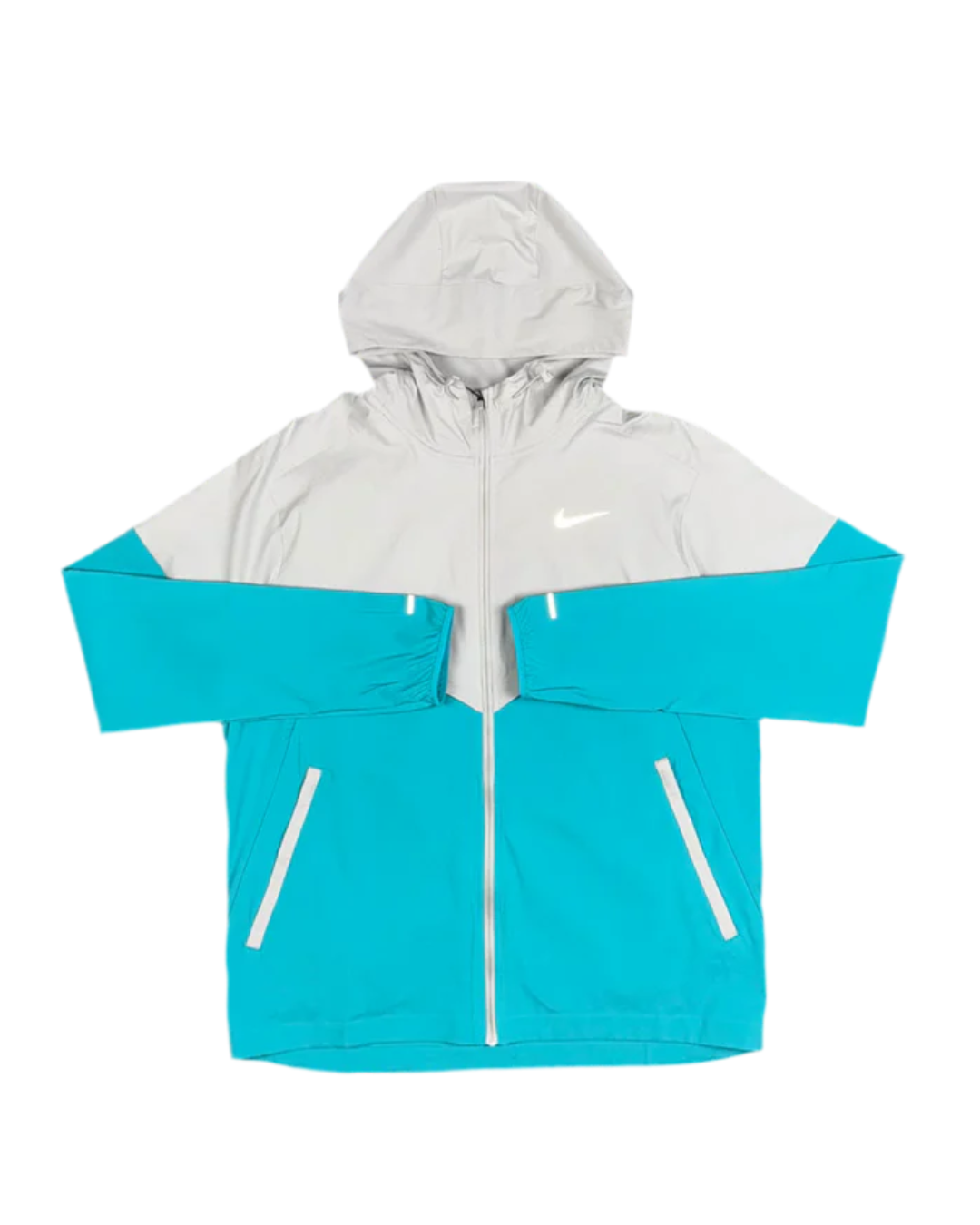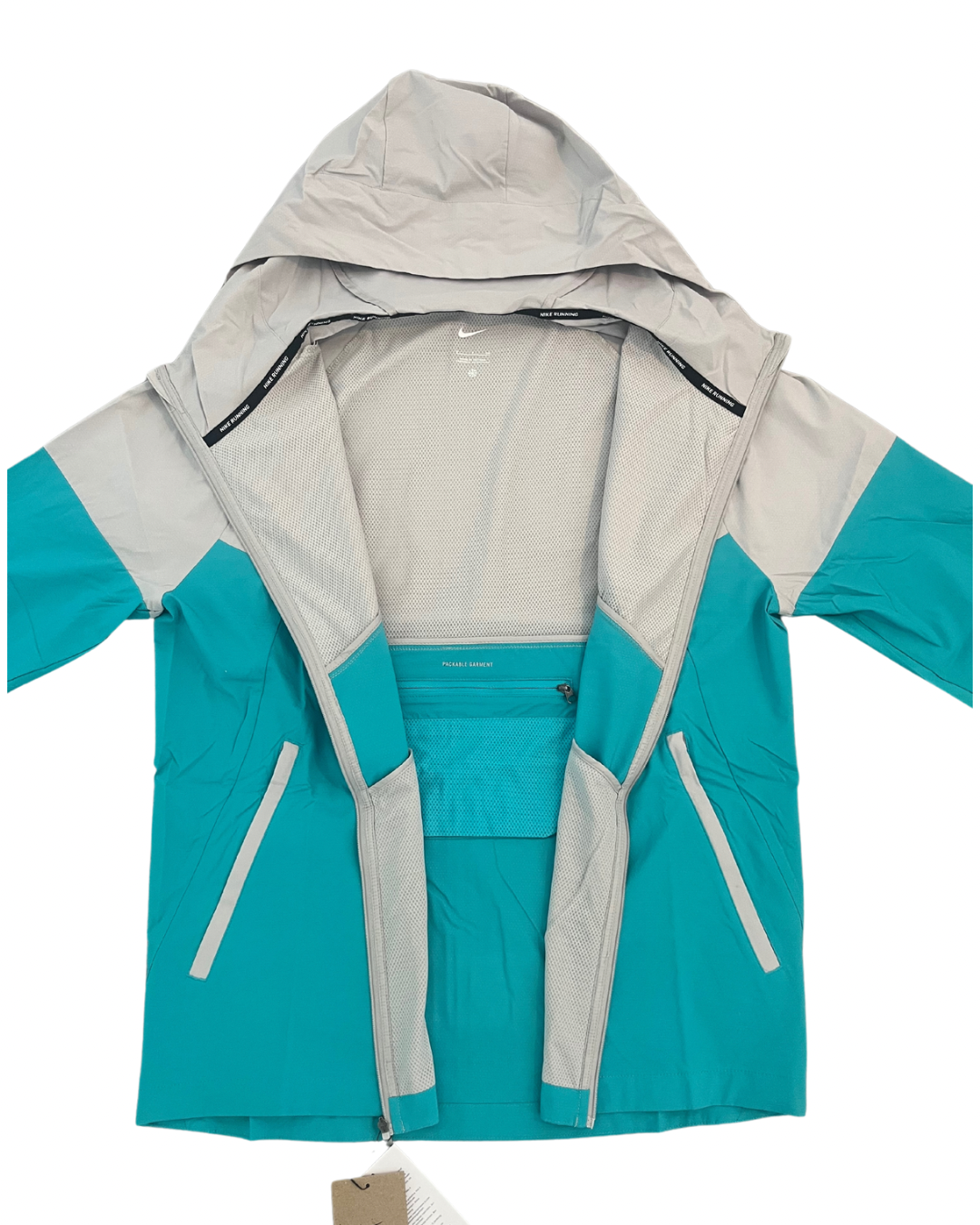 Bad weather? No stress. Stay covered in this men's Packable Jacket from Nike. In Light Iron Ore and Dusty Cactus colourway, this jacket is made from UV-blocking, water-resistant fabric for total protection against the elements. It features a full-length zipper and a bungee-adjustable hood for custom coverage, and a vent at the back for extra airflow. With zippered side pockets for storage, it's signed off with chevron design lines and the Swoosh logo on the chest. Machine washable.